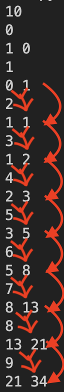 위 사진은 '해결방법 1'의 T값에 10을 넣어 0~9까지 출력한 결과이다. 위 결과를 보면 N==0과 N==1에도 피보나치와 같은 규칙이 있다는 것을 알 수 있다. (이전 N==0과 N==1의 합은 count_one)